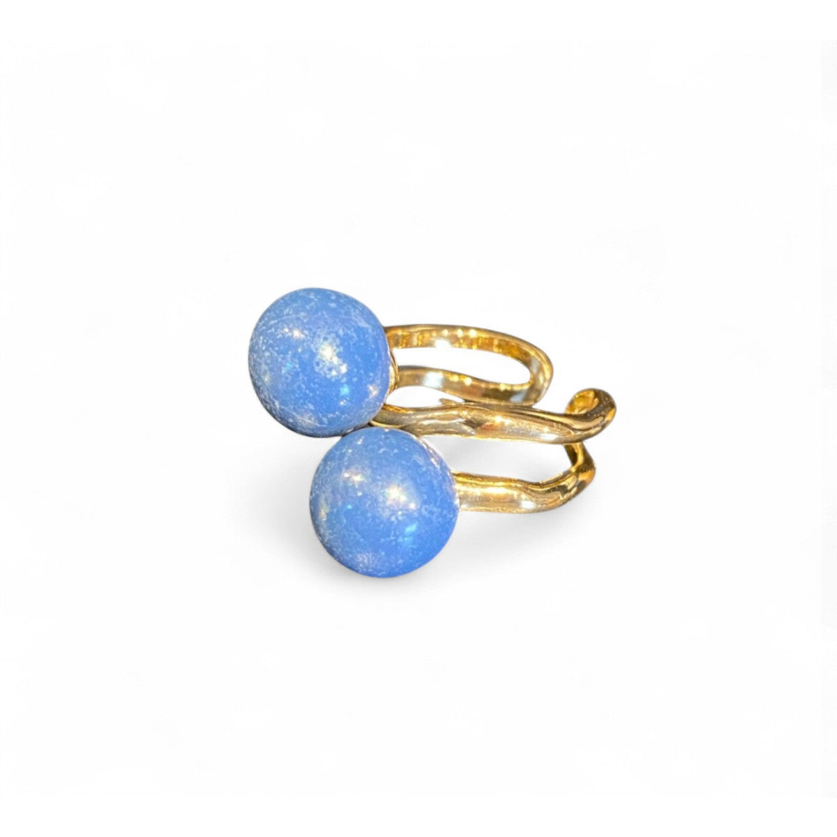 Smuk håndlavet strikkering udført i forgyldt messing med 2 små Kazuri keramikperler. Glaseret med en smuk blå glasur.